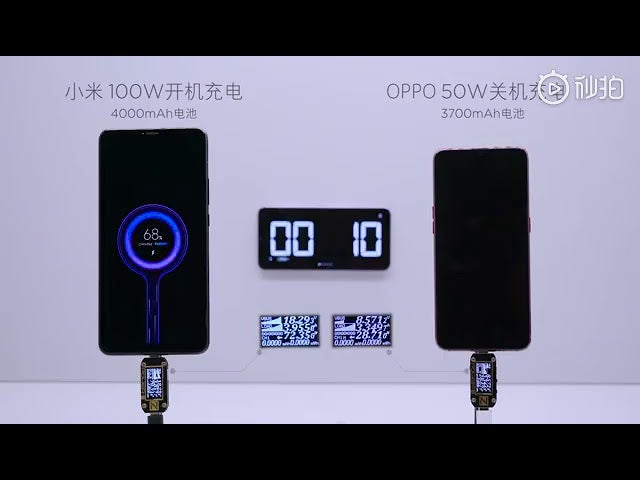 Lo anunció el presidente de la compañía, Bin Lin, quién además compartió un video de demostración desde la web Weibo. En la pieza visual vemos que el cargador consigue que un teléfono con batería de 4.000mAh (sin nombre) se complete al 100% en esos 17 minutos, mientras que un cargador de 50W de Oppo solo logra cargar un teléfono con una batería de 3.700mAh al 65% en el mismo tiempo.